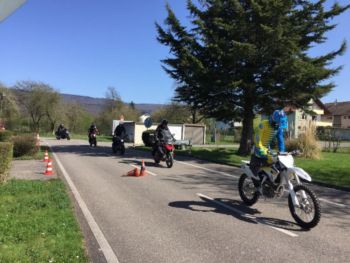 Nach dem Aufwärmtraining bei 30 Grad wurden die vorbereitenden Übungen durchgeführt, so z. B.: Motorrad rangieren, einen eng gesteckter Slalom durchfahren, über eine Leiter und über eine Holzdiele fahren, ohne hiervon abzukommen, Kurven mit Lenkimpuls und optimaler Blickführung fahren, Bremsen üben mit Ausweichen ins Gelände sowie Berganfahren und Drehen am Berg.